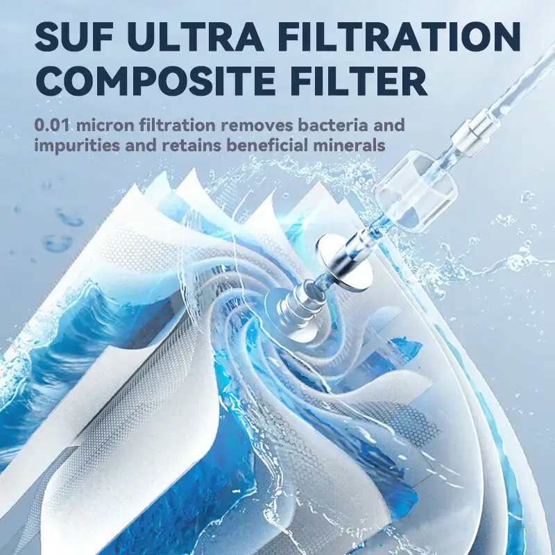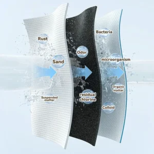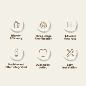 - Three-stage ultraf iltration system: high-quality PP cotton filter + imported coconut shell sintered activated carbon filter + imported high-quality